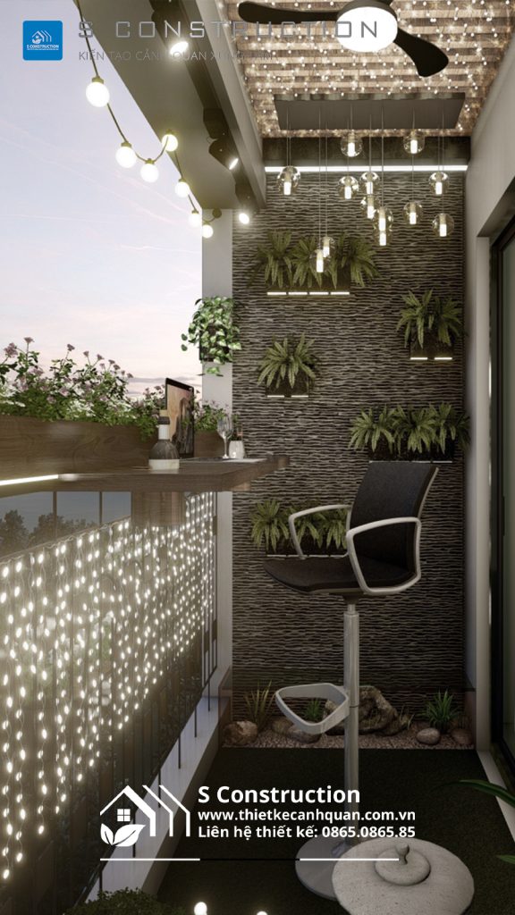 Ban công trên chung cư này được thiết kế hiện đại với bàn uống trà kiêm làm việc, mang lại góc nhìn toàn cảnh thành phố. Dọc theo ban công là bồn hoa thơm ngát. Điểm nhấn nổi bật là tiểu cảnh tường nước kết hợp cây xanh và chiếu sáng, tạo không gian thư giãn. Trần ban công được trang trí đèn lấp lánh và đèn rọi, lý tưởng để làm việc hoặc đọc sách vào buổi tối. Đây là không gian hoàn hảo để thư giãn, uống trà và tận hưởng khoảnh khắc “chill” tuyệt vời.